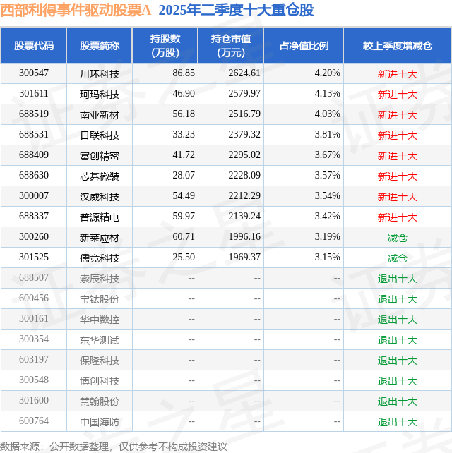 西部利得事件驱动股票A的前十大重仓股如下:
